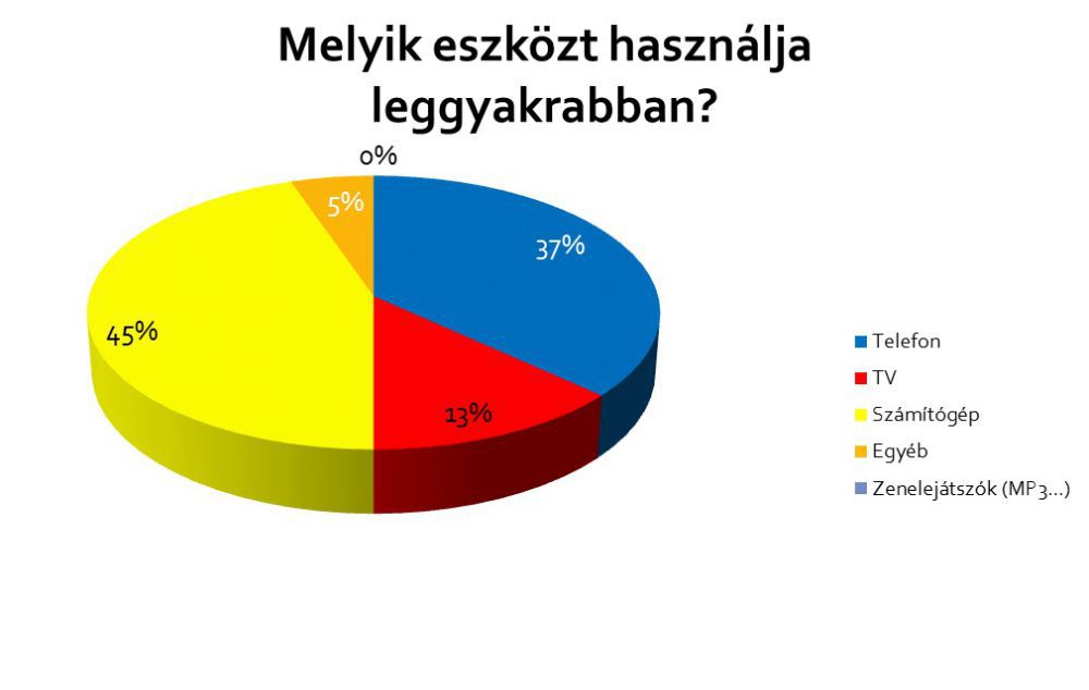 A statisztika alapján az emberek 0%-a választotta a zenelejátszót, 5%-az egyebet, 13%-a a tv-t, 37%-a a telefont és 45%-a a számítógépet. Ez alapján azt következtethetjük le, hogy az emberek nagyobb része használja a számítógépet és a zenelejátszókat egyáltalán nem is használják a kitöltők.