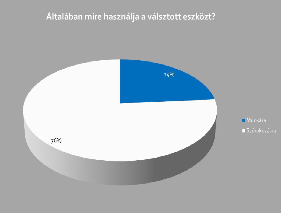 A statisztika szerint az emberek 24%-a munkára és 76%-a szórakózásra használja a kiválasztott eszközt ez azt jelenti, hogy 9 ember használja munkára és 29 ember használja szórakozásra.