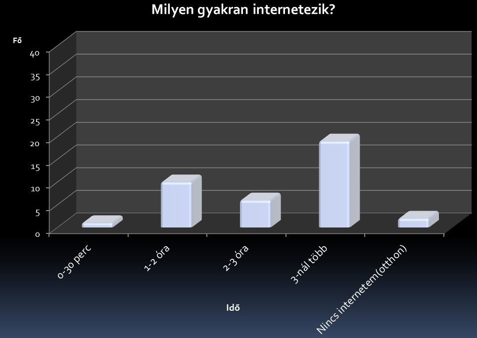 Ahogy az az ábrán is látszik 1 ember 0-30 percet, 10 ember 1-2 órát, 6 ember 2-3 órát és 19 ember 3 órától több időt tölt el az internet "előtt" és végül 2 ember választotta azt hogy nincs otthon internetje ezek szerint ők a munkahelyükön vagy egy internetkávézóban töltötték ki.